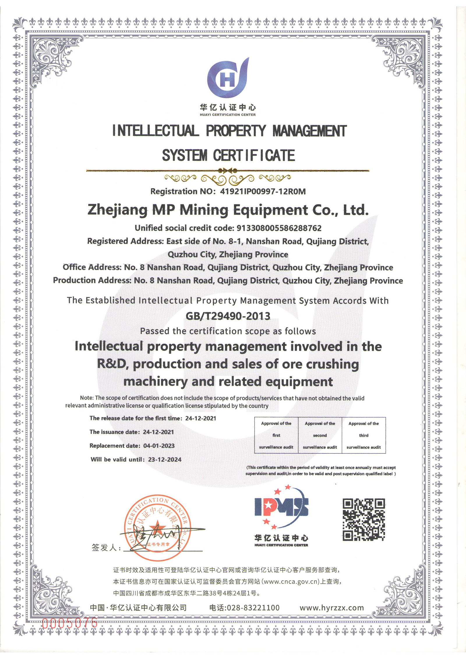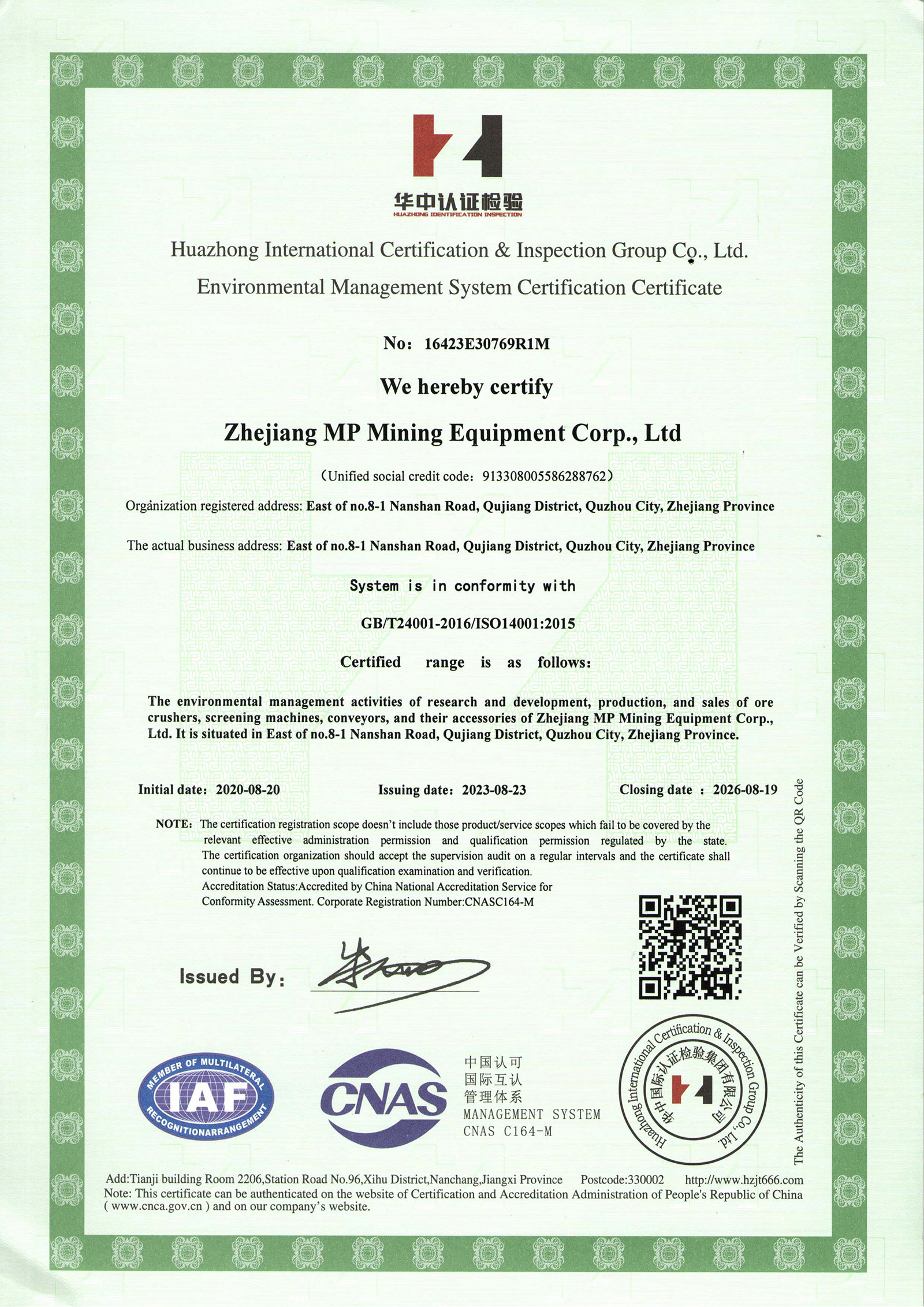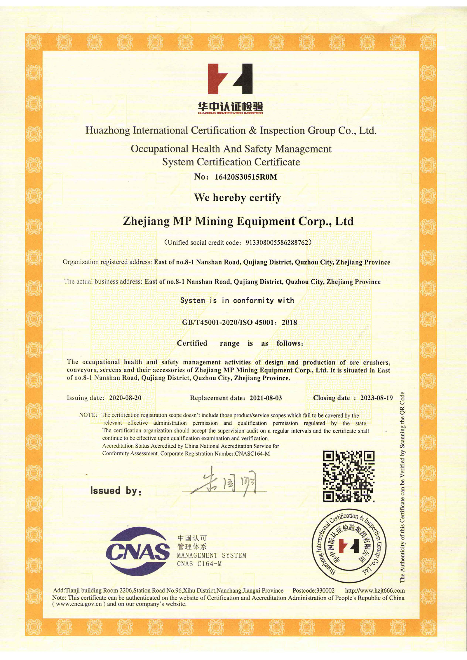 Zhejiang MP Mining Equipment Corp., Ltd (formerly Quzhou MP Mining Machinery Co., Ltd.) is a technology enterprise specializing in R&D, production, sales and service of high-end crushing equipment. Established in July 2010, it is located at No. 8 Nanshan Road, Qujiang District, Quzhou City, Zhejiang Province. It covers an area of more than 50 acres and has a registered capital of 22.325 million yuan. We have more than 110 employees, of which 36.36% are college graduates or above. R&D personnel accounted for 16.36% of the total number of employees. Mining Partner passed the ISO9001:2015 international quality management system certification. In September 2015, Mining Partner's stock was listed on the NEEQ China (stock code: 833507).